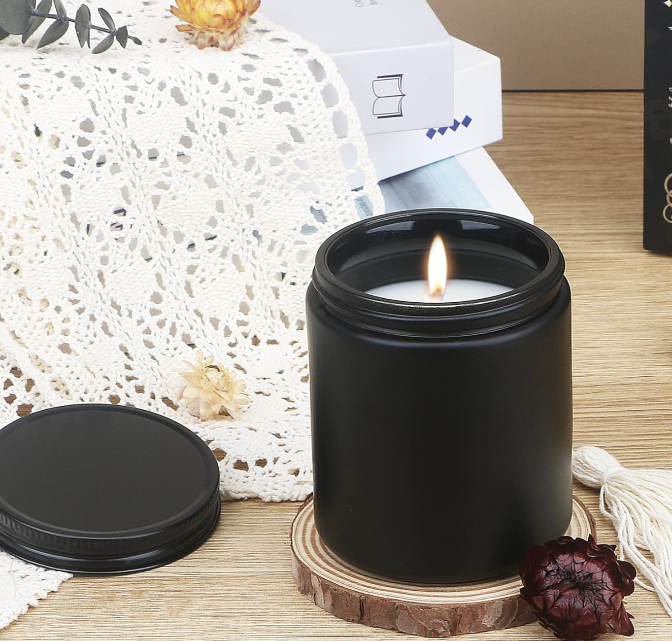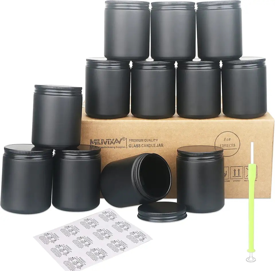 The 12-pack 8 oz matte black candle jars with lids are perfect for my soy candle business – thick glass holds heat well during pouring, and the black lids give a premium look. Dishwasher safe makes cleanup easy. No leaks or cracks after multiple uses. Great for wholesale or gifting – customers love the sleek matte finish!