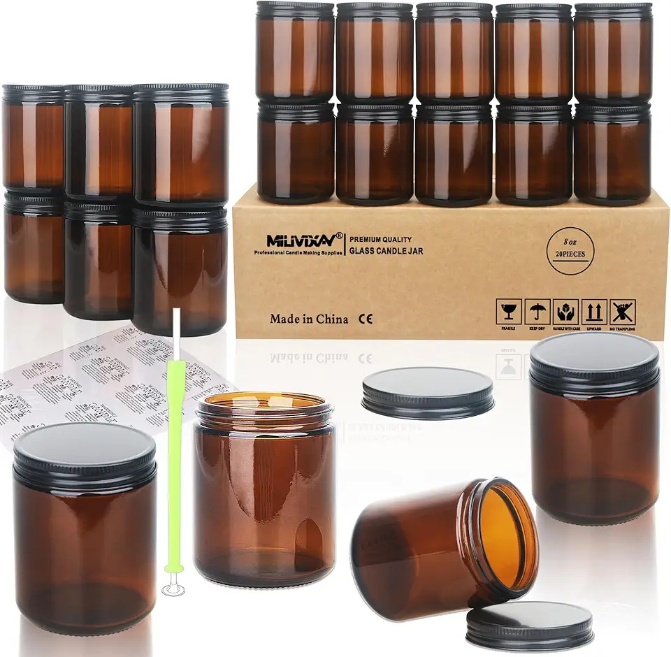 The 20-pack dark amber 8 oz jars are ideal for my bath salt and candle line – amber tint protects contents from light, and matte lids match perfectly. Sturdy glass and tight seal keep products fresh. Bulk price is unbeatable for small makers. Versatile for spices too – highly recommend for anyone crafting in volume.